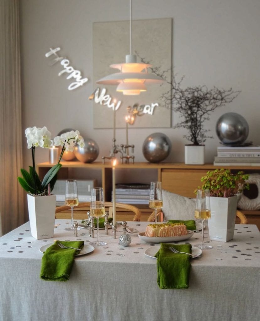 This elegant New Year’s Eve setup blends soft neutrals with pops of fresh green and silver for a modern, cozy vibe. With flickering candles, sparkling champagne flutes, and metallic accents, it’s the perfect mix of calm sophistication and festive sparkle to welcome the new year in style.