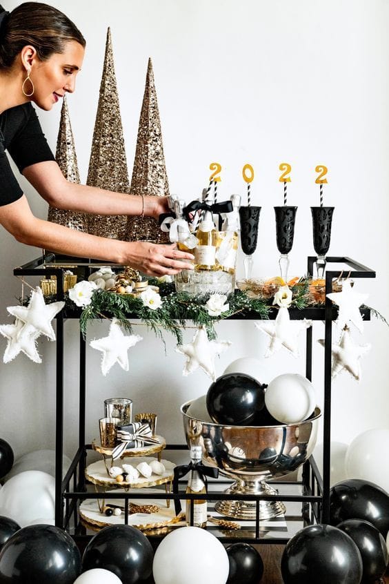 A festive bar cart dazzles with black, white, and gold accents—think gleaming baubles, sparkling cone trees, and glitzy “2022” drink stirrers. White star garlands mingle with lush greenery and elegant glassware, while black and white balloons add a playful pop, creating a chic scene for New Year’s cheers.