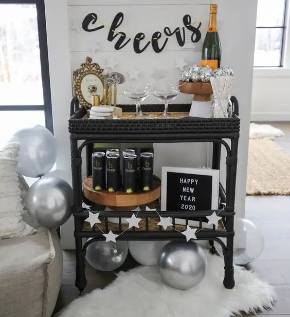 A cozy corner features a stylish bar cart illuminated by metallic star garlands and soft silver balloons. Champagne bottles, shimmering drinkware, and a bold “Cheers” banner set a celebratory tone, perfect for toasting the new year in relaxed, modern elegance.