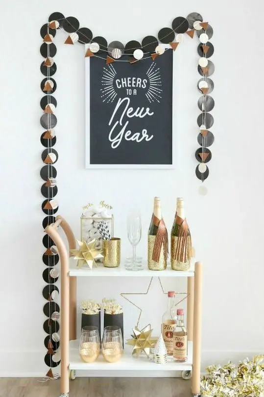 A minimalist bar cart pops with gold-tipped champagne bottles, metallic garlands, and geometric stars beneath a bold “Cheers to a New Year” sign. Black, gold, and white tones blend for a fresh, festive look accented by sparkling glasses and playful details.