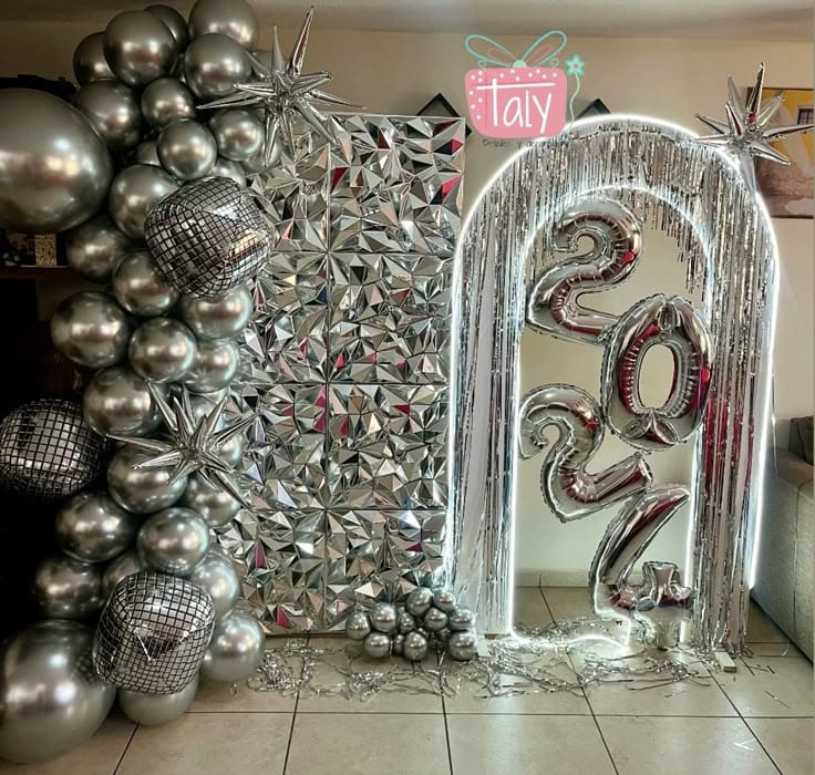 A dazzling entrance glows with wall-to-wall silver—mirror balloons, geometric panels, and oversized “2024” numbers outlined in sparkling fringe. The scene’s futuristic shine makes it perfect for Insta-worthy New Year’s Eve photos and high-energy celebrations.