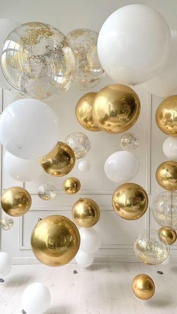 A stunning arrangement of glossy white and gold balloons, with accents of transparent glitter-filled bubbles, creates a dreamy, floating illusion. The palette is crisp and glamorous, setting a chic and celebratory mood for any New Year’s Eve gathering.