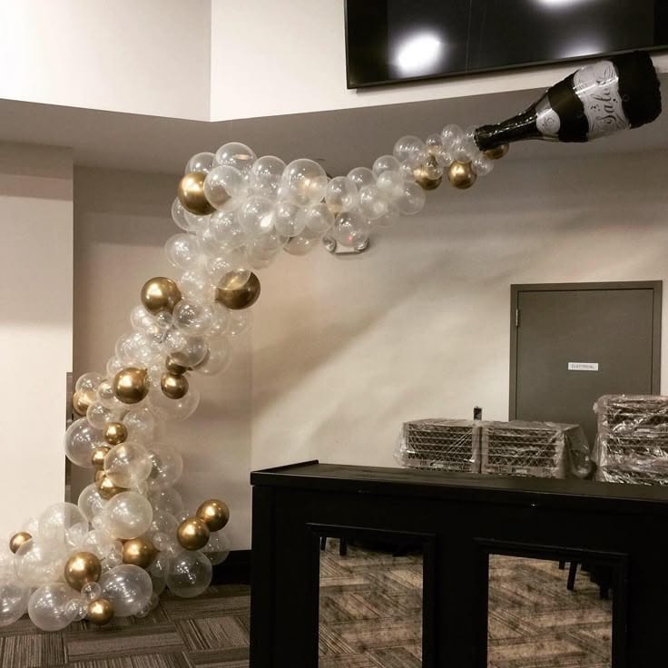 A creative balloon display bursts from a giant champagne bottle, sending a stream of clear and gold balloons arching across the room. The bubbly effect is playful and bold, making the space feel instantly festive and perfect for welcoming the new year.