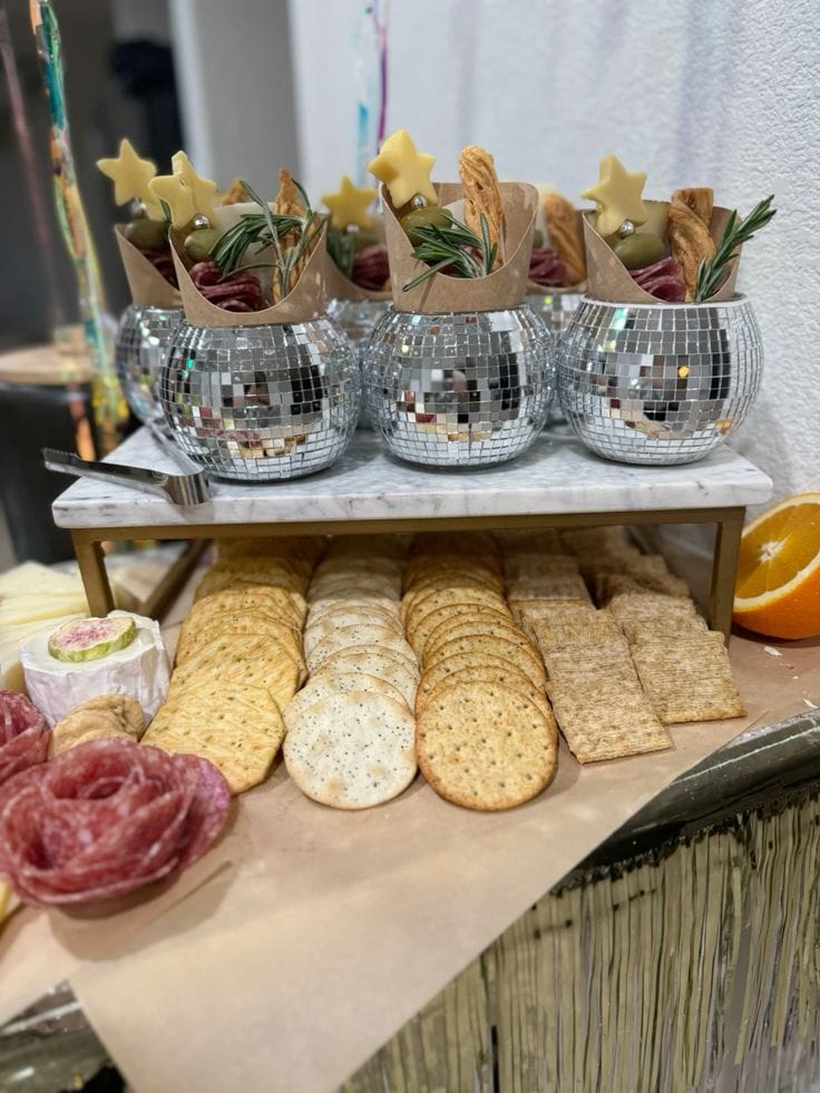 Mini charcuterie cups dazzle in mirrored disco balls, crowned with star-shaped cheese, rosemary sprigs, and savory bites. Below, a selection of crackers and salami roses creates a fun, stylish spread that invites guests to graze and celebrate in sparkling style.