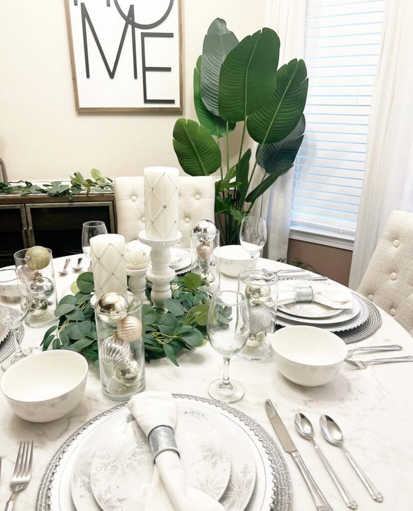 A timeless mix of white, silver, and greenery sets the stage for a classy New Year’s Eve dinner. From sparkling ornaments in glass vases to candlelight and lush leaves, this setup feels fresh, festive, and effortlessly elegant—perfect for ringing in the new year with style.