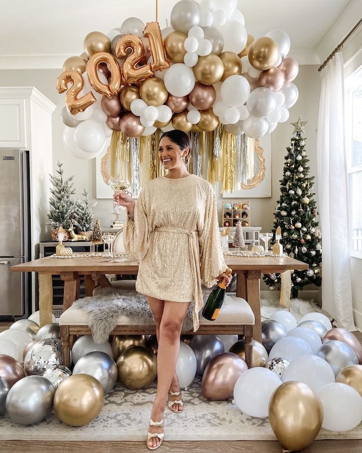 A stylish party scene features a chic guest in a champagne dress, centered beneath a dramatic balloon installation in gold, white, and bronze. The room sparkles with festive details, disco balls, and hints of winter greenery, capturing the excitement of New Year’s Eve in pure elegance.