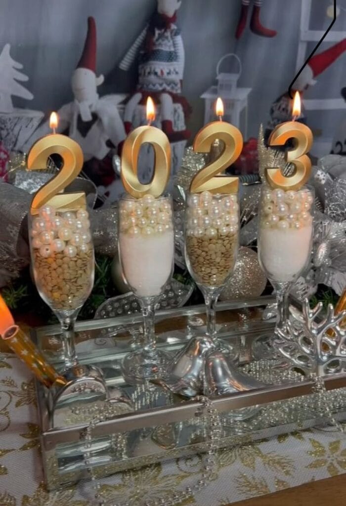 Gold number candles rise from elegant champagne flutes filled with shimmering beads and pearls. The sparkling centerpiece radiates a festive glow, making your table a memorable focal point to ring in the new year.