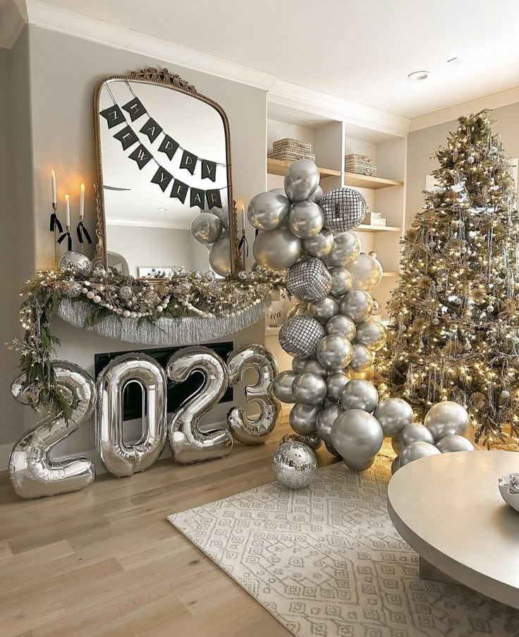 A sparkling living room bursts with silver—from “2023” balloon numbers and disco balls to lush garlands, metallic ornaments, and a shimmering tree. Soft champagne lights and cascading silver balloons make the whole space feel radiant and celebratory.