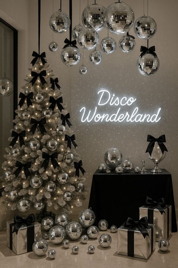 A silvery scene bursts with disco balls, black bows, and shimmering ornaments on a frosted tree, set against a bold “Disco Wonderland” neon sign. Stacked silver gifts and glimmering baubles create a playful, glamorous vibe fit for a sparkling countdown bash.