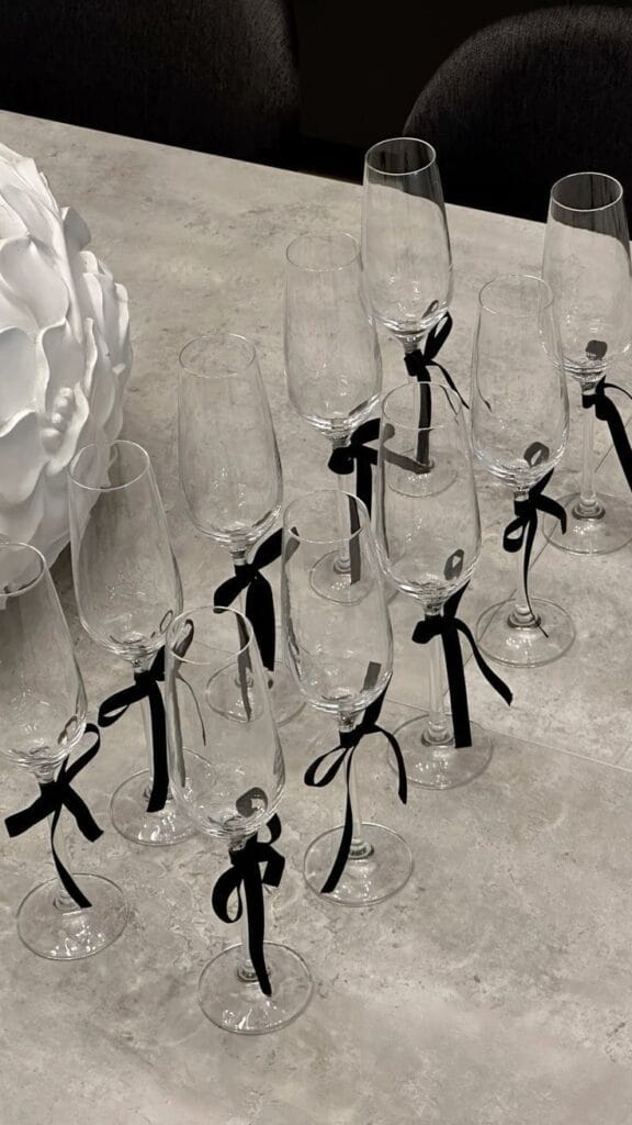 Elegant champagne flutes are dressed up with chic black velvet bows at the base, adding a refined touch to your party table. The monochrome look is minimal and timeless—perfect for a sophisticated New Year’s celebration.