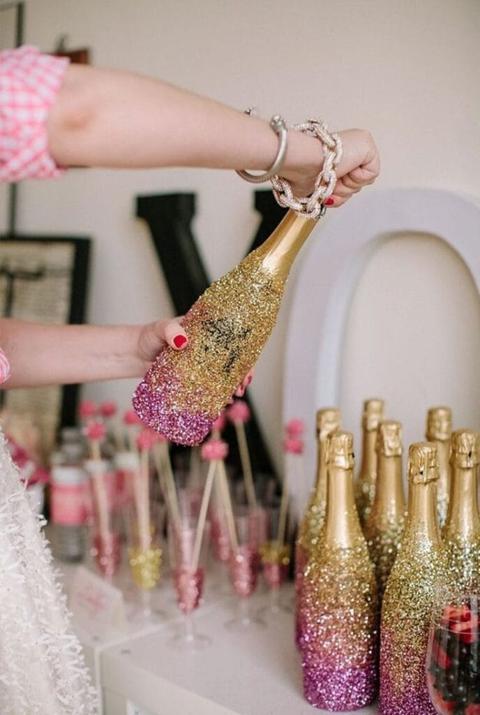 Glitter-dipped champagne bottles in sparkling gold and pink steal the spotlight, surrounded by matching drink stirrers and festive glasses. The scene glows with playful glam, creating a lively vibe perfect for a night of New Year’s cheer.