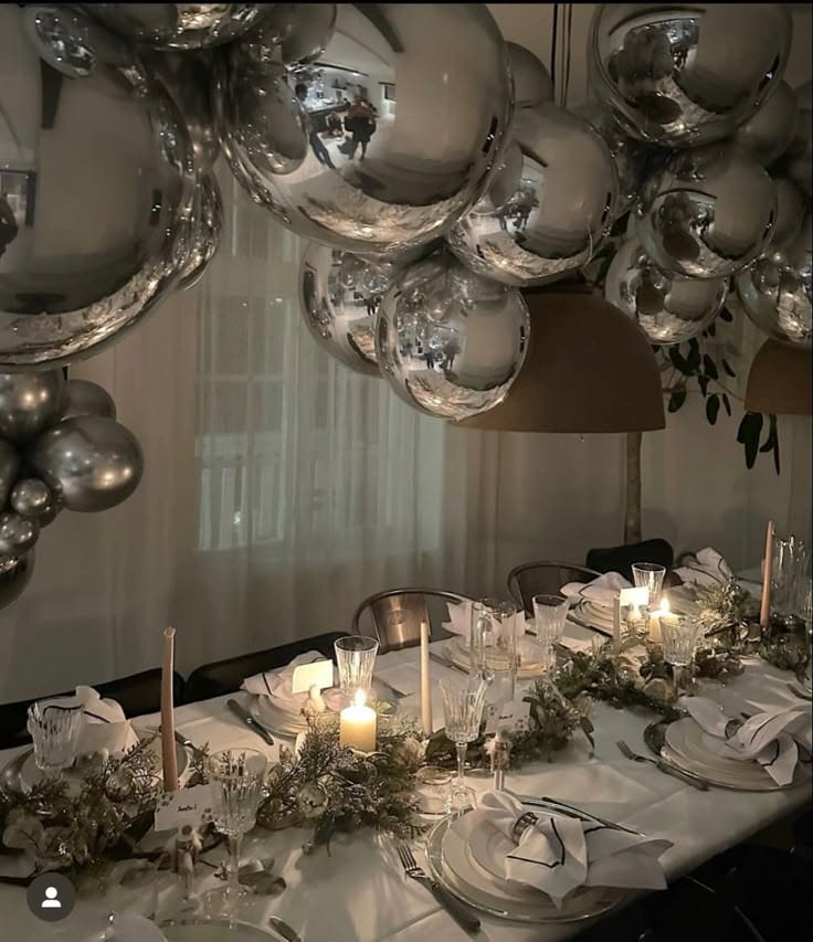 A dramatic cluster of giant silver balloons floats above an elegantly set table dressed in white linens, crystal glassware, and fresh evergreens. Candlelight glows softly below, creating a modern, glamorous vibe that feels both cozy and unforgettable.