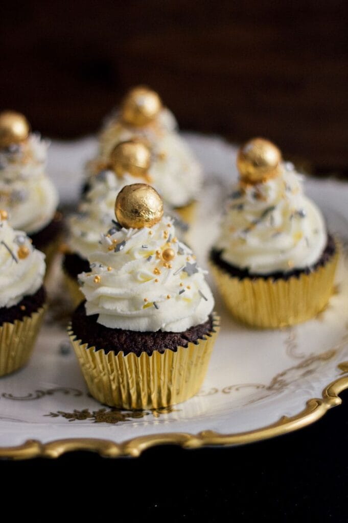 Rich chocolate cupcakes are crowned with swirled buttercream, gold candy orbs, and sparkling sprinkles, each nestled in a metallic gold liner. The decadent, festive treats add a touch of luxe and a pop of shimmer to your holiday dessert spread.