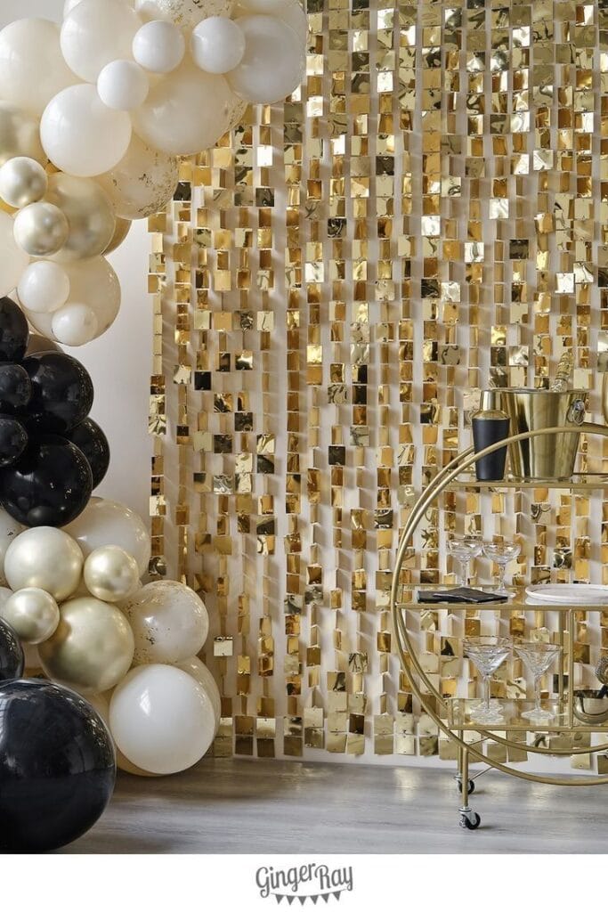 A mosaic gold sequin wall and a luxe bunch of black, white, and gold balloons create a dazzling party nook. Gold barware and modern glassware on a chic circular cart make this a radiant spot for celebratory sips and Instagram-worthy photos.