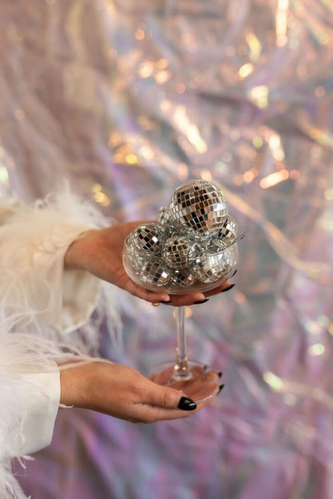 A coupe glass overflows with tiny disco balls, set against a shimmering iridescent backdrop and held by hands in a feathery white sleeve. The scene sparkles with playful glam—perfect for a festive, retro-inspired New Year’s Eve moment.