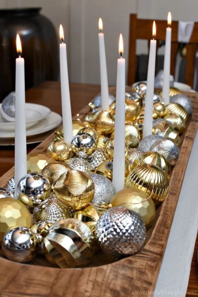 A row of tall white candles glows above a rustic tray overflowing with gold and silver ornaments in every texture. The candlelight and metallic baubles set a warm, festive mood for an elegant New Year’s Eve dinner.