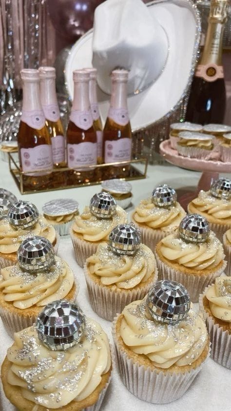 Vanilla cupcakes shimmer with silver sprinkles and mini disco ball toppers, surrounded by blush sparkling wine and glitzy party hats. The sparkling treats and pastel accents create a playful yet glamorous setup—ideal for a retro-chic New Year’s celebration.