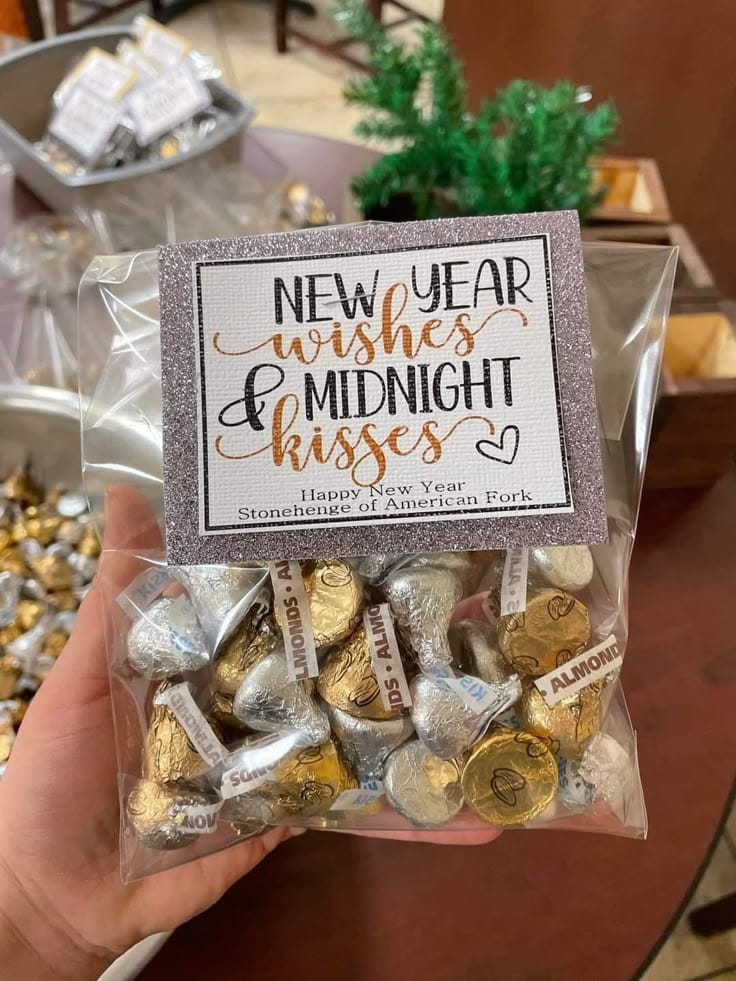 A clear treat bag filled with gold and silver Hershey’s Kisses is labeled with the sweet message, “New Year Wishes & Midnight Kisses.” This charming favor mixes sparkle and sentiment—perfect for sending guests home with a little extra celebration.