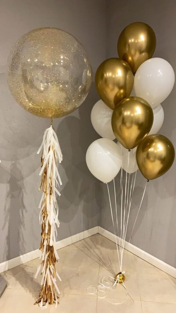 A giant glitter-filled balloon with a long tassel stands next to a lush bouquet of metallic gold and white balloons. This eye-catching duo creates a chic, modern vibe that glimmers with festive elegance—effortless for any glamorous New Year’s Eve gathering.