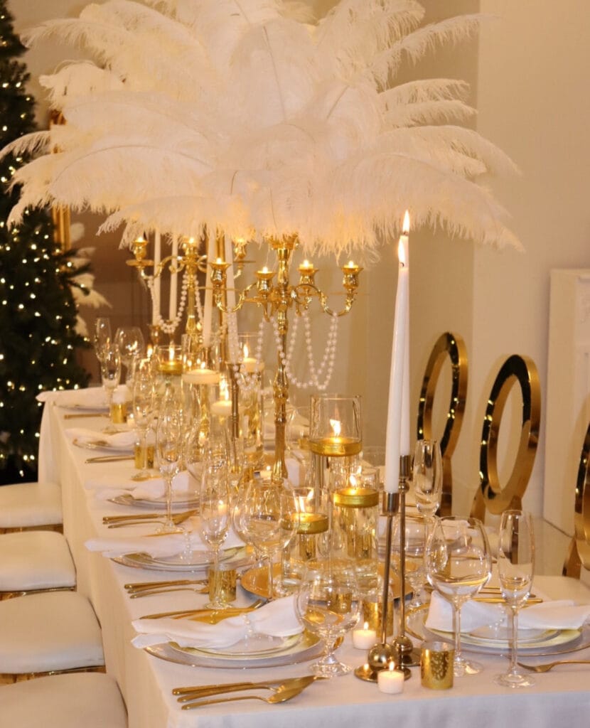 An elegant tablescape dazzles with sweeping white feathers, lustrous pearls, and golden candlelight. Layers of metallics and soft ivory invite guests to indulge in a sophisticated celebration draped in holiday sparkle.