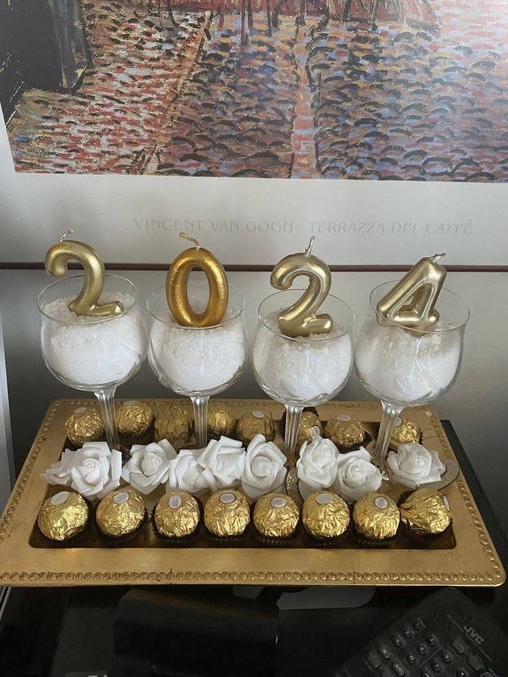 Shimmering gold number candles “2024” pop atop snowy white glasses, framed by delicate white roses and luxe Ferrero Rocher chocolates. The elegant tray radiates good cheer and celebration—perfect for a dazzling dessert table or festive centerpiece.