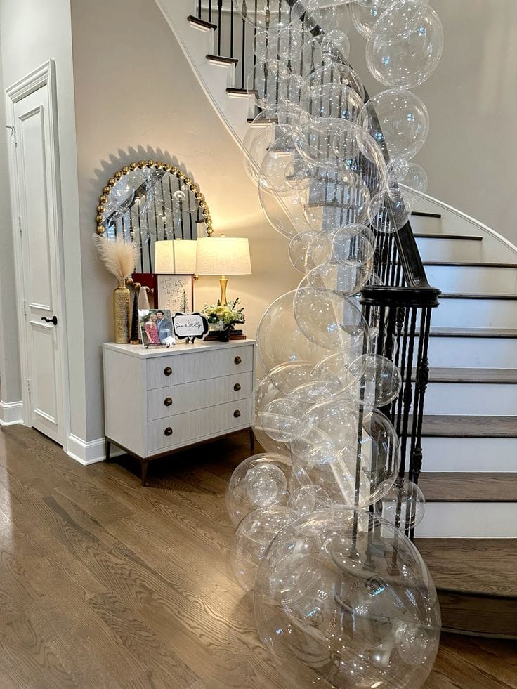 A cascade of giant clear balloons flows up a dark staircase, catching the soft glow from gold accents and a round, mirrored lamp below. The airy decor brings playful sophistication and a modern twist to your New Year’s Eve entrance.