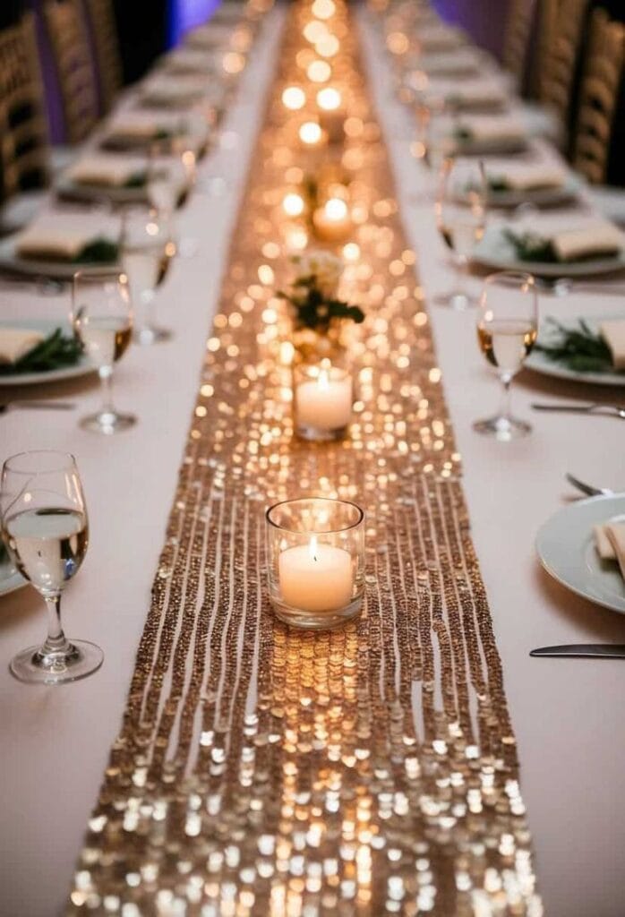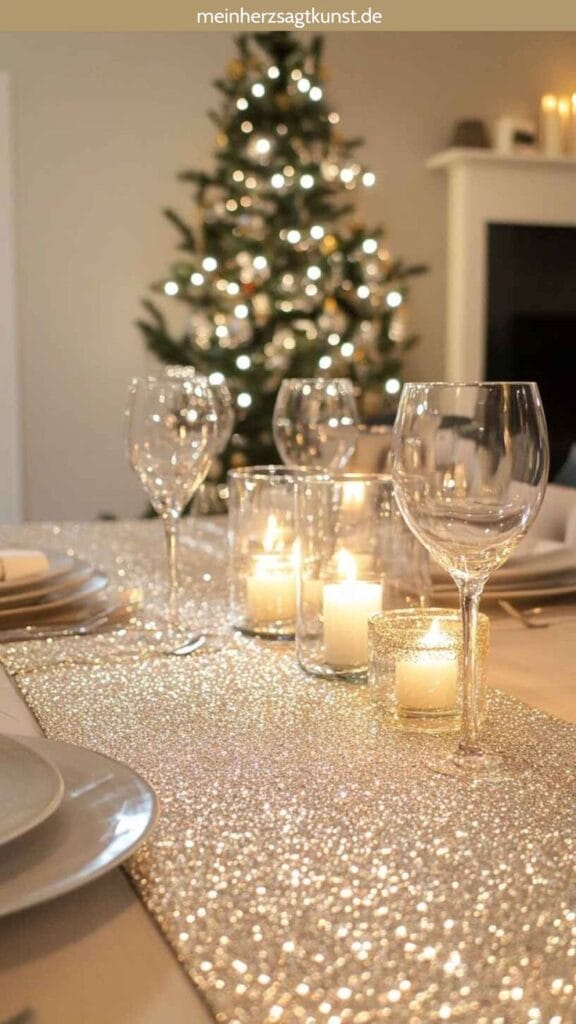 A glamorous, glittering table runner is paired with gleaming wine glasses and soft candlelight, set in front of a twinkling holiday tree. The silver shimmer and cozy lights create an inviting, upscale atmosphere that’s perfect for ringing in the new year.