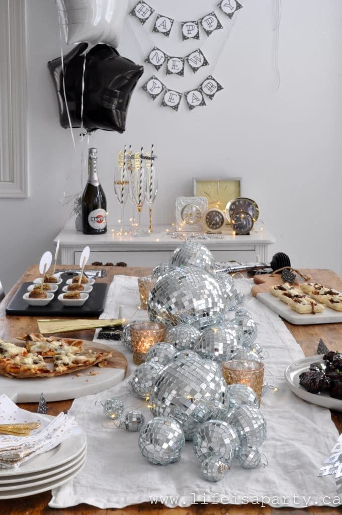 A playful centerpiece of glimmering disco balls winds through a spread of sparkling cocktails, savory bites, and candlelight. Black and silver party details, from star balloons to clocks and banners, create a chic, festive mood ready for ringing in the new year.