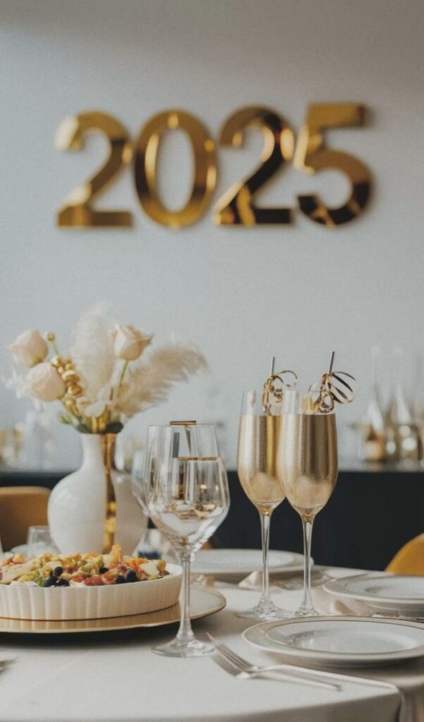 A chic dining table features gold-rimmed glasses, modern metallic flutes, and soft neutral blooms, all beneath dazzling gold “2025” numerals. The delicate ivory and gold palette, paired with refined tableware and understated festive touches, creates a luxurious yet welcoming New Year’s Eve setting.