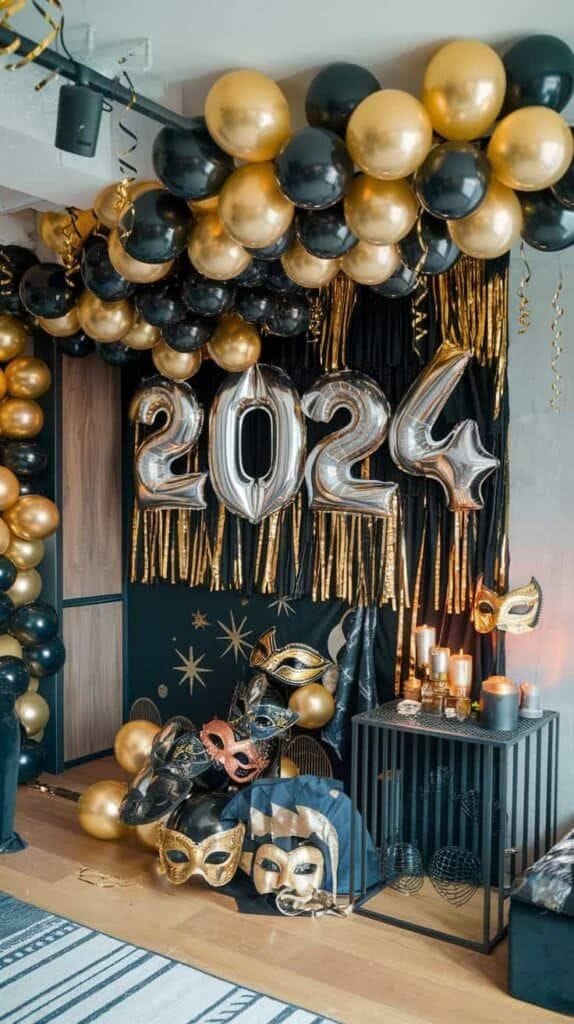 Striking clusters of gold and black balloons frame bold silver “2024” numbers, with masquerade masks and candlelight adding dramatic, mysterious touches. Festive garlands and star accents infuse this party corner with playful elegance and a hint of masquerade glam.