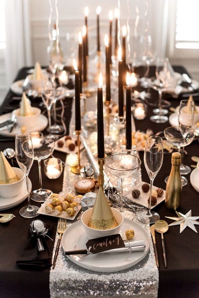 A black tablecloth sets the stage for glowing black candles and shimmering silver runners, accented with gold party hats, elegant glassware, and sparkling treats. The modern color palette of black, gold, and silver creates a luxe, festive mood, perfect for ringing in the new year with sophisticated flair.