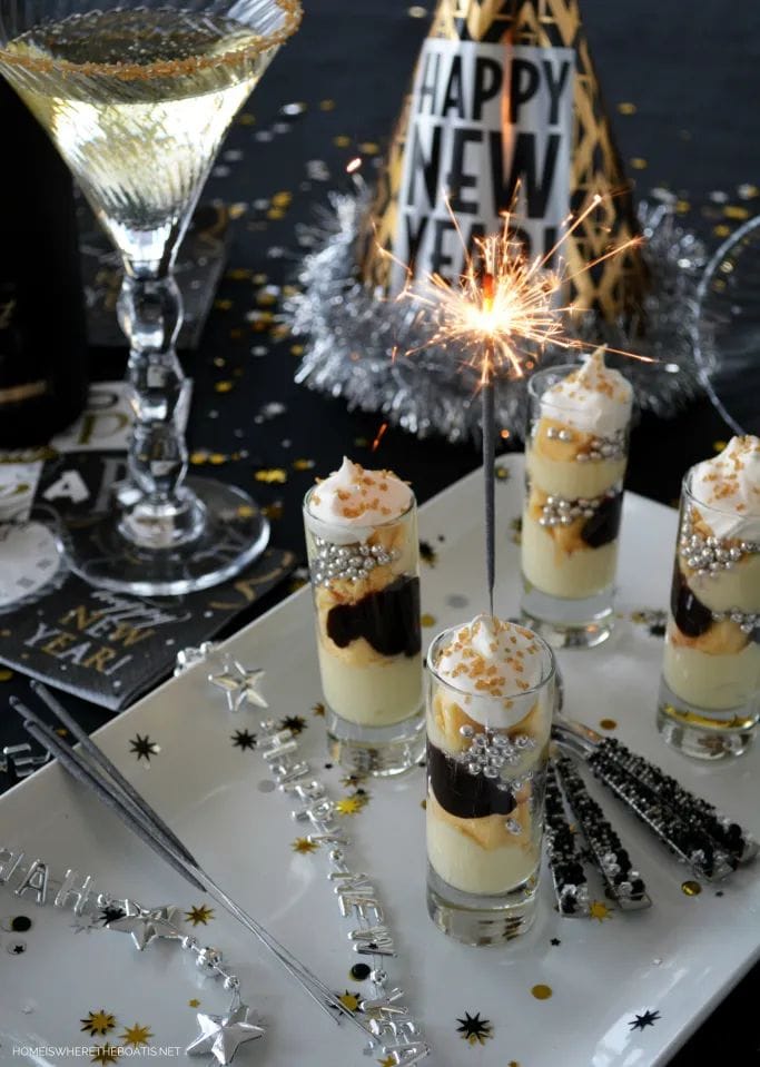 Mini parfaits swirl with creamy layers, sparkling sprinkles, and rich chocolate, each topped with silver beads and a lively sparkler. The black, gold, and silver theme is accented by “Happy New Year” party hats and confetti, creating a whimsical, celebratory vibe for midnight treats.