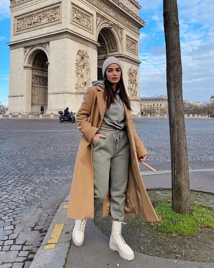 Sheās owning the scene in a luxe camel coat thrown over a soft sage green hoodie and joggers, striking a pose by the Arc de Triomphe. Those chunky white boots ground the flowy layers for a fresh, urban edge.