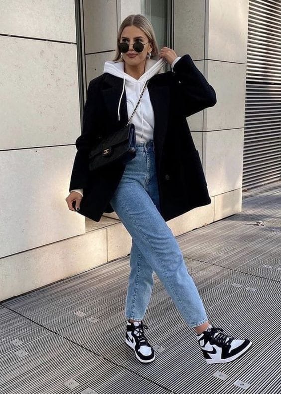 She’s channeling cool-girl vibes in a tailored black blazer layered over a crisp white hoodie, tucked into high-waisted blue jeans against an urban backdrop. The black chain-strap bag and chunky black-white sneakers amp up the street-style edge.