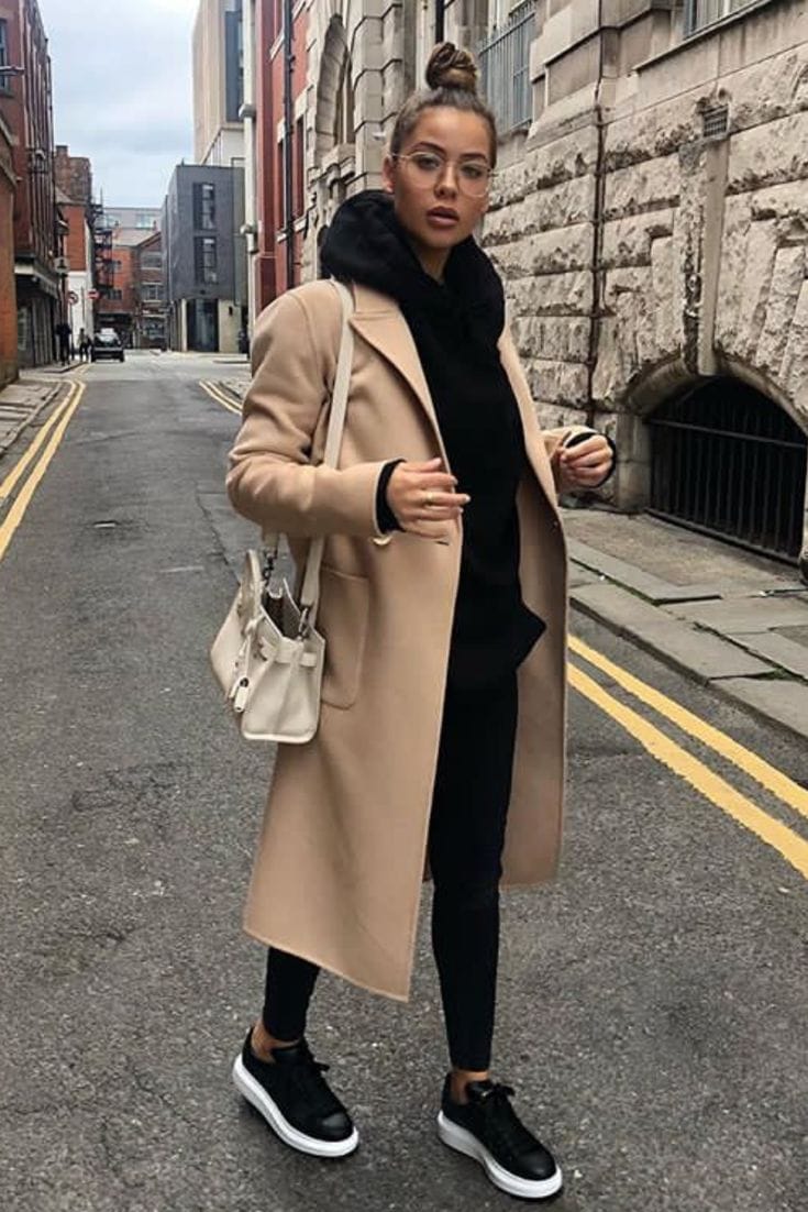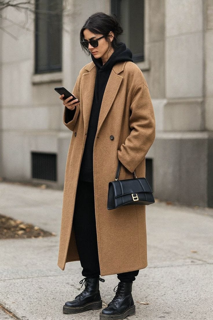 16. Luxe Camel Coat over Black Hoodie Tracksuit