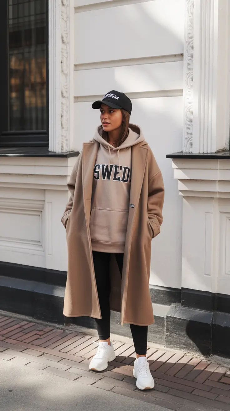 This oversized camel coat over a creamy hoodie emblazoned with “Sweden” and sleek black leggings is street-style magic against grand architecture. The black cap and crisp white sneakers keep it fresh and travel-ready.ā
