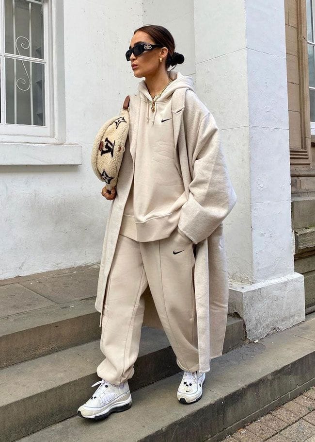 Babe, this massive beige coat draped over a Nike hoodie and matching pants is stair-step chic against crisp white walls. The woven bag and white sneakers scream effortless athleisure glow-up.
