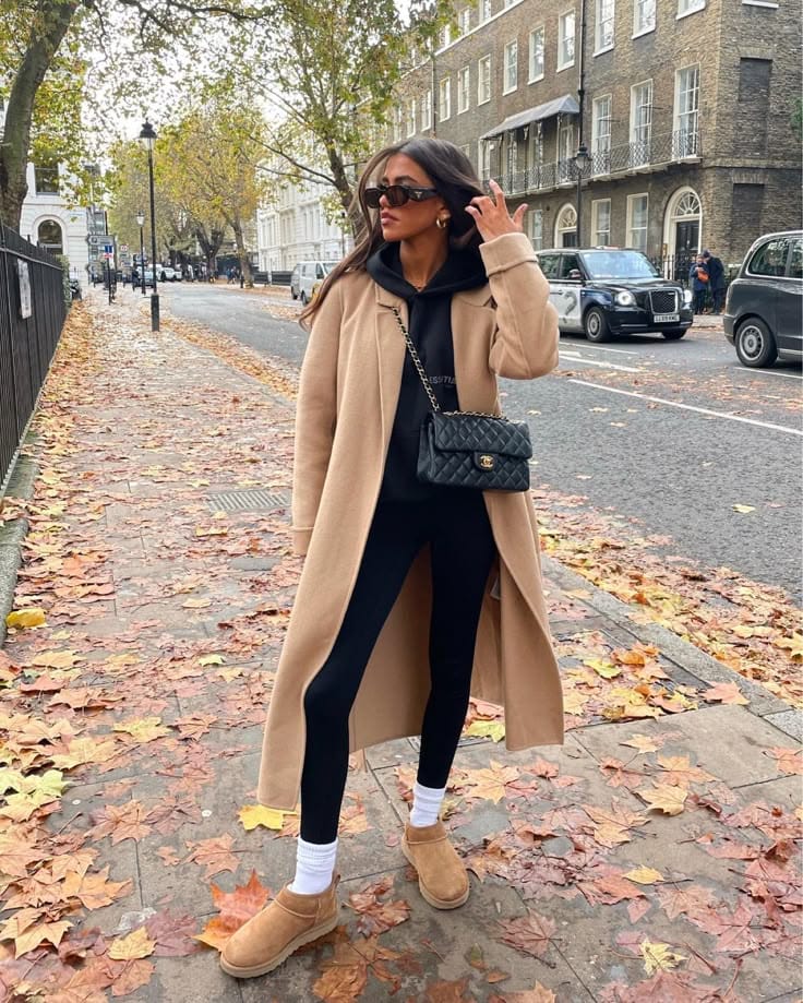 She’s strutting fall streets in a plush camel coat layered over a black hoodie and sleek black leggings, surrounded by golden leaves and city charm. Sunnies, Chanel bag, and Ugg boots make it cozy luxe perfection.
