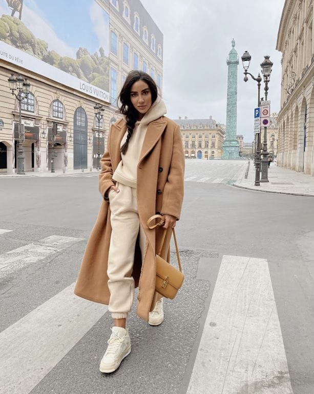 She’s channeling Parisian chic in a tailored camel coat layered over a soft cream hoodie and matching sweats. That yellow bag and white sneakers add the perfect pop to this cozy travel look.