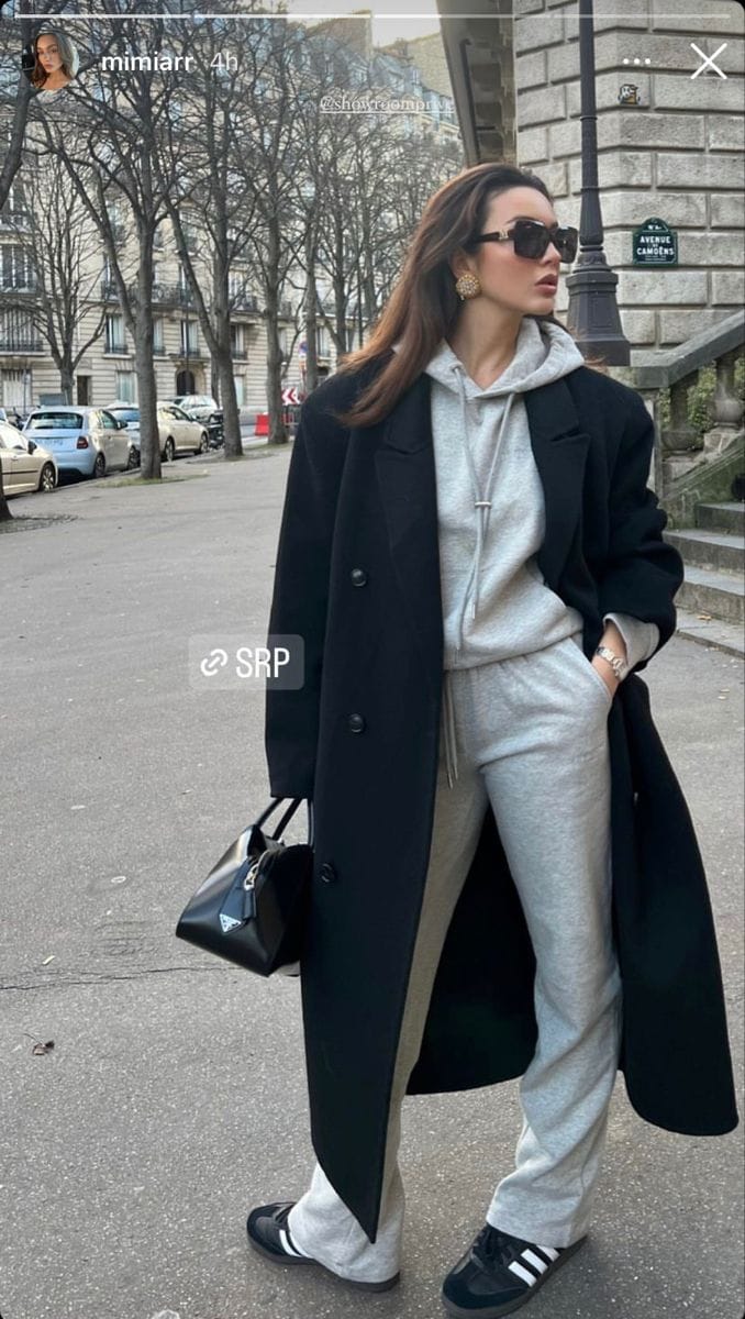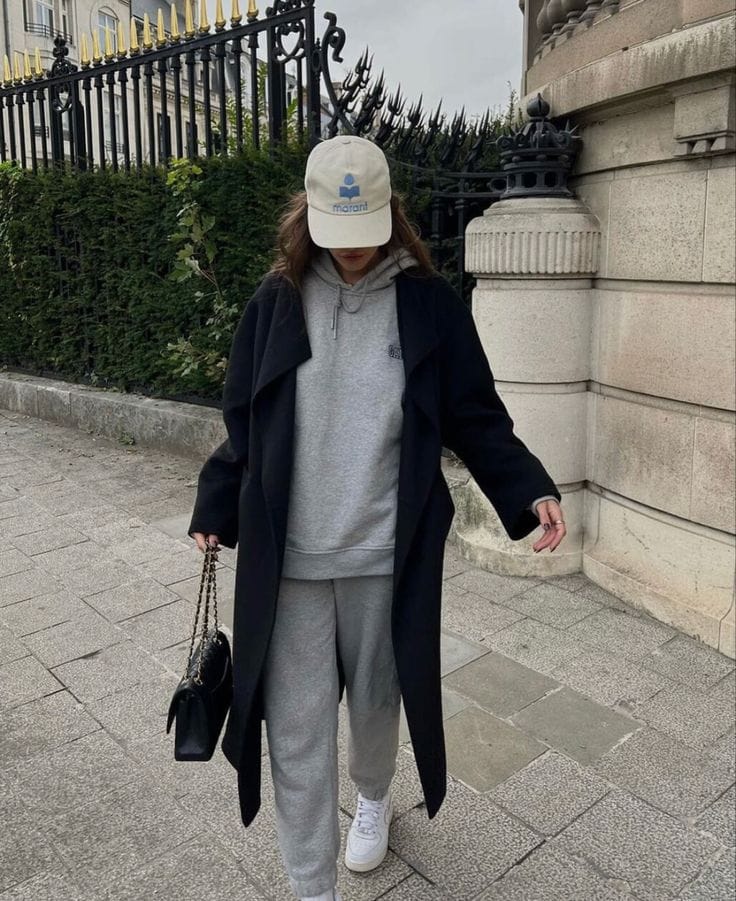 Sheās layering a long black coat over a plush gray hoodie and matching wide-leg sweatpants for that effortlessly chic street vibe. The oversized coat drapes perfectly, adding drama to the comfy sweatsuit while she strolls Parisian streets.
