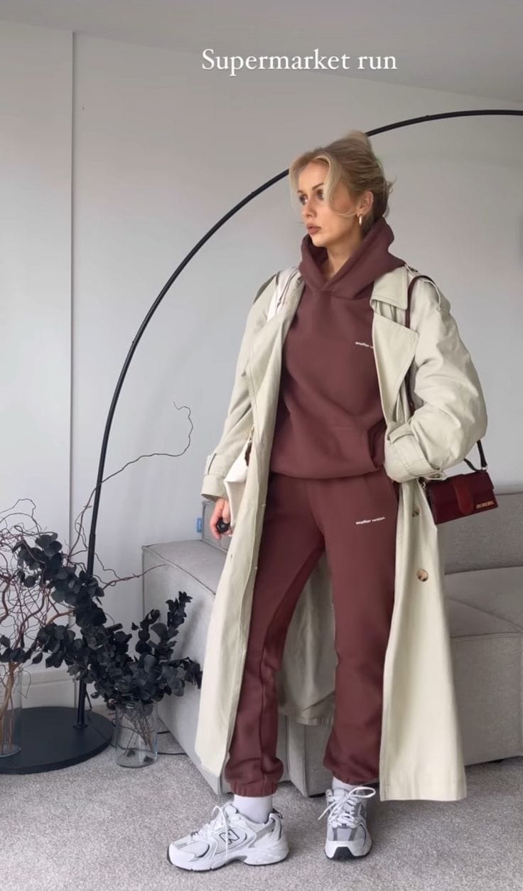 She’s slaying the supermarket run in a flowy beige trench draped over a matching burgundy hoodie and sweats, keeping it cozy yet polished indoors. Those white sneakers add a sporty touch to the luxe layersātotal errand glam!ā