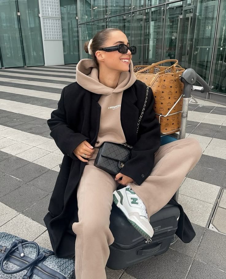 This black coat layered over a creamy beige hoodie and pants is airport-chic goals, complete with sunnies and a luggage vibe. She’s smiling with a mini bag and woven tote, plus those green-accent sneakers for travel edge.ā