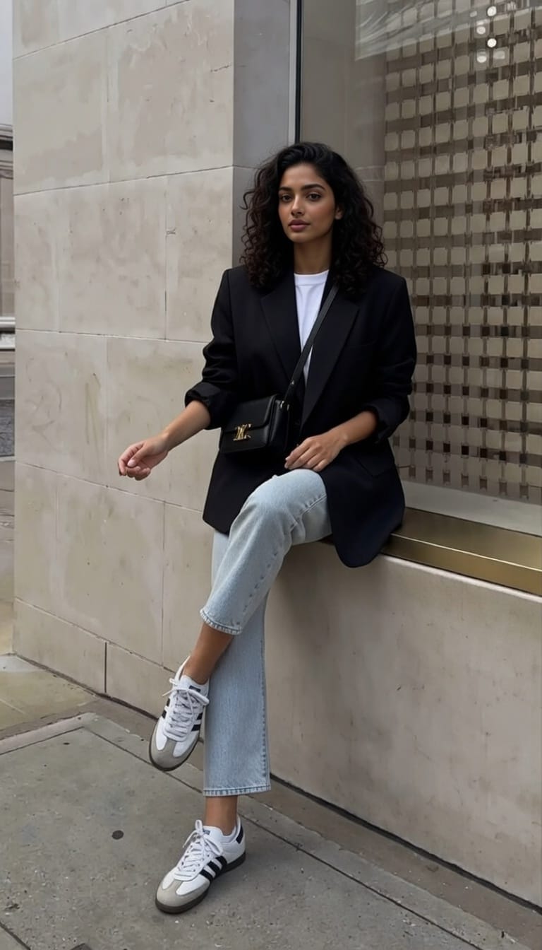 This effortlessly polished outfit features an oversized black blazer layered over a classic white tee and light-wash denim for a sleek, timeless look. Adidas Samba sneakers add a sporty yet trendy touch, while a structured black handbag and bold sunglasses enhance the sophisticated vibe. Perfect for a city-ready, effortlessly cool aesthetic.