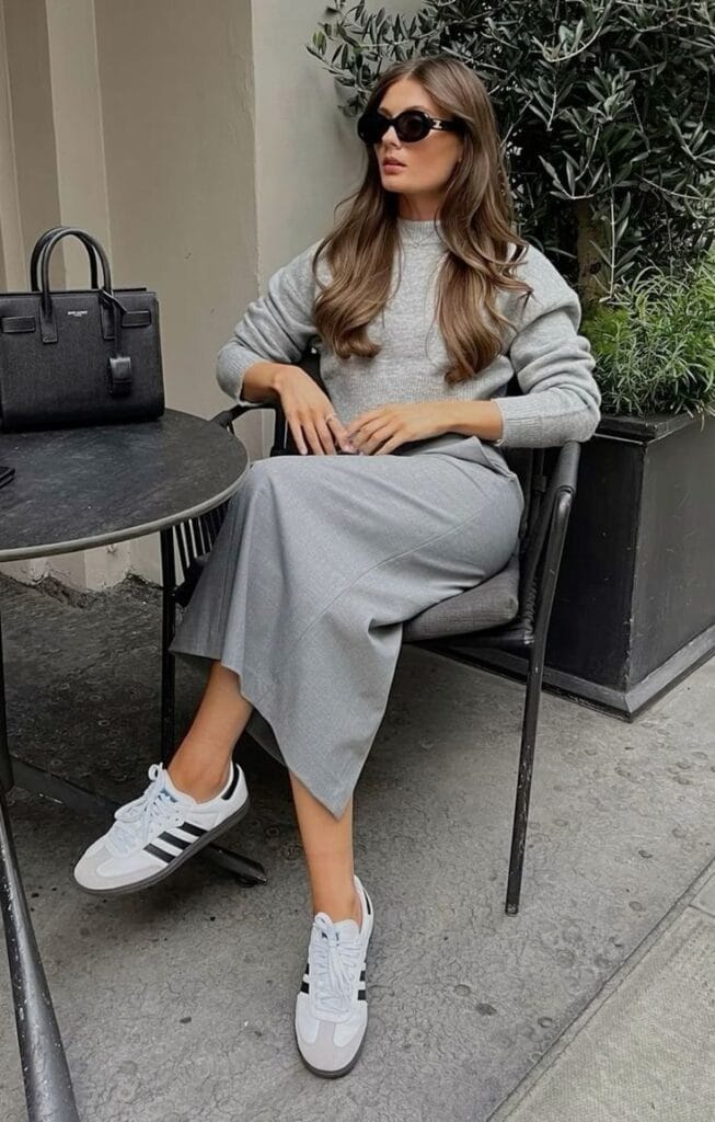 This effortlessly elegant outfit features a soft grey knit sweater paired with a matching midi skirt for a refined, tonal look. Adidas Samba sneakers bring a sporty contrast, making the ensemble both chic and comfortable. A structured black handbag and bold sunglasses add a touch of sophistication to this modern, street-style aesthetic.