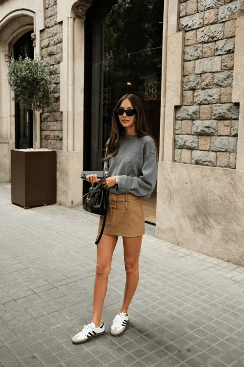 This effortlessly stylish outfit features a relaxed grey knit sweater paired with a structured tan mini skirt for a balanced mix of cozy and polished. Adidas Samba sneakers add a sporty, laid-back vibe, while a sleek black handbag and sunglasses elevate the look. Perfect for an effortlessly cool city stroll.