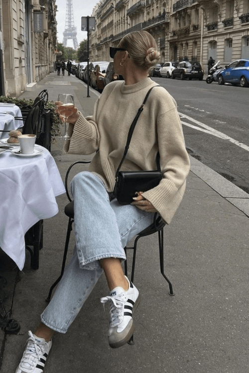 This effortlessly stylish look features a relaxed beige knit sweater paired with light-wash denim for a timeless, cozy aesthetic. Adidas Samba sneakers add a sporty edge, while a sleek black crossbody bag and oversized sunglasses bring a touch of elegance. Perfect for a chic cafƩ moment with a Parisian flair.