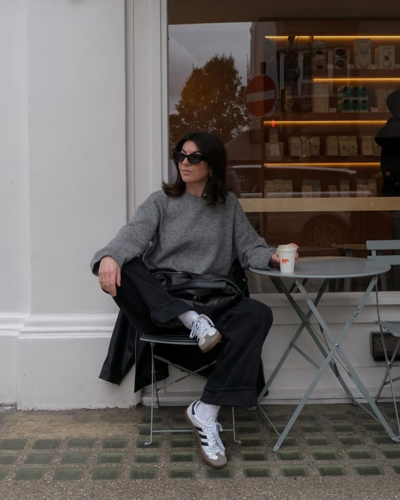 This effortlessly cool outfit features a cozy oversized grey sweater paired with wide-leg black jeans for a relaxed, modern vibe. Adidas Samba sneakers add a sporty touch, while sleek sunglasses and a black leather bag complete the minimalist aesthetic. Perfect for a stylish yet laid-back coffee moment.