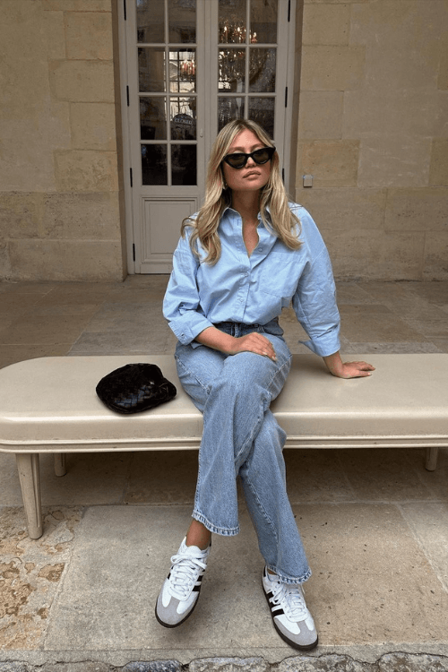 This effortlessly chic outfit pairs a relaxed blue button-up with high-waisted straight-leg jeans for a timeless, polished look. Adidas Samba sneakers add a sporty touch, balancing casual comfort with refined elegance. A sleek black woven bag and oversized sunglasses complete this modern yet classic aesthetic.