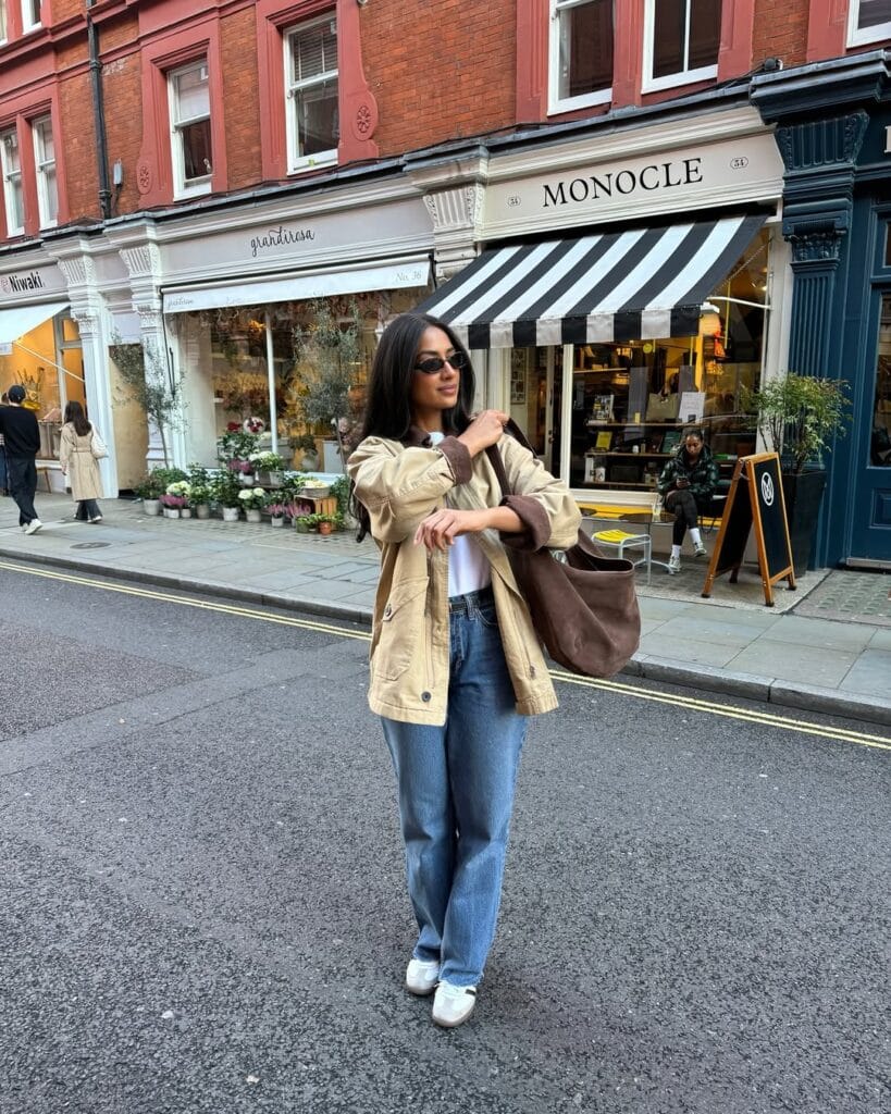 This laid-back yet polished outfit features a relaxed beige utility jacket over a classic white tee and straight-leg denim for a timeless street-style vibe. Adidas Samba sneakers add a sporty edge, while a suede tote bag and sleek sunglasses complete the effortlessly cool aesthetic. Perfect for a casual city stroll with a touch of vintage charm.