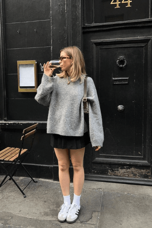 This effortlessly stylish outfit combines an oversized grey knit sweater with a classic black pleated mini skirt for a chic yet cozy look. Adidas Samba sneakers and white socks add a sporty edge, while a vintage-inspired shoulder bag and retro sunglasses elevate the ensemble. Perfect for a laid-back yet fashion-forward city stroll.
